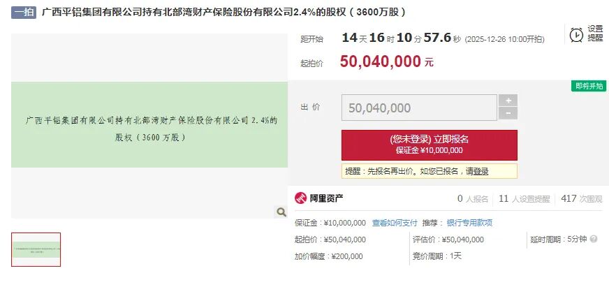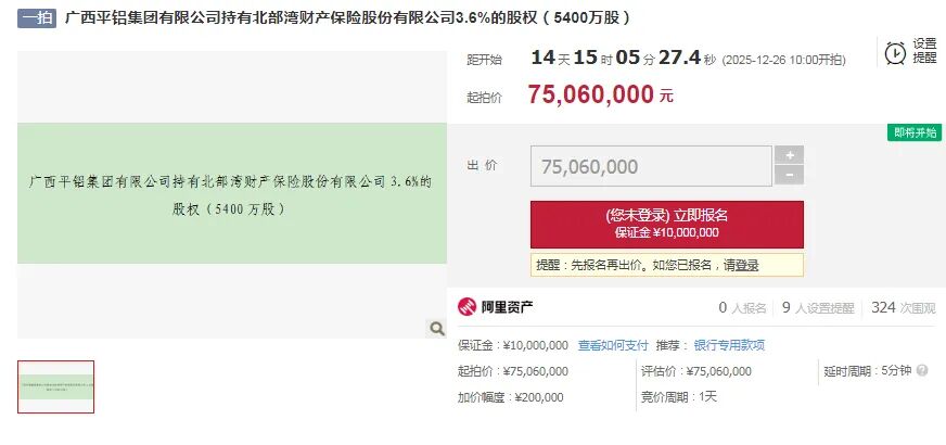 拍卖信息显示,该笔股权将被拆分为两笔进行拍卖。其中,5400万股起拍价0.75亿元,3600万股起拍价0.50亿元简配资,合计起拍价1.25亿元。若顺利找到接盘方,广西平铝集团将彻底退出北部湾财险股东行列。